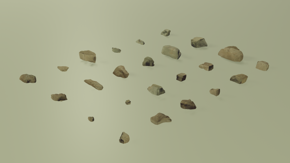 - Average per rock: 205 vertices, 201 faces, and 399 triangles.